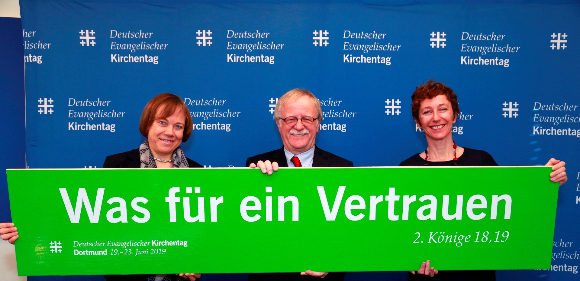 „Was für ein Vertrauen“ lautet die Losung des Kirchentages 2019 in Dortmund. Sie präsentieren (von links): Annette Kurschus, Präses der Evangelischen Kirche von Westfalen, Hans Leyendecker, Kirchentagspräsident, und Julia Helmke, Generalsekretärin des Deutschen Evangelischen Kirchentages. Foto: DEKT/Silvia Kriens