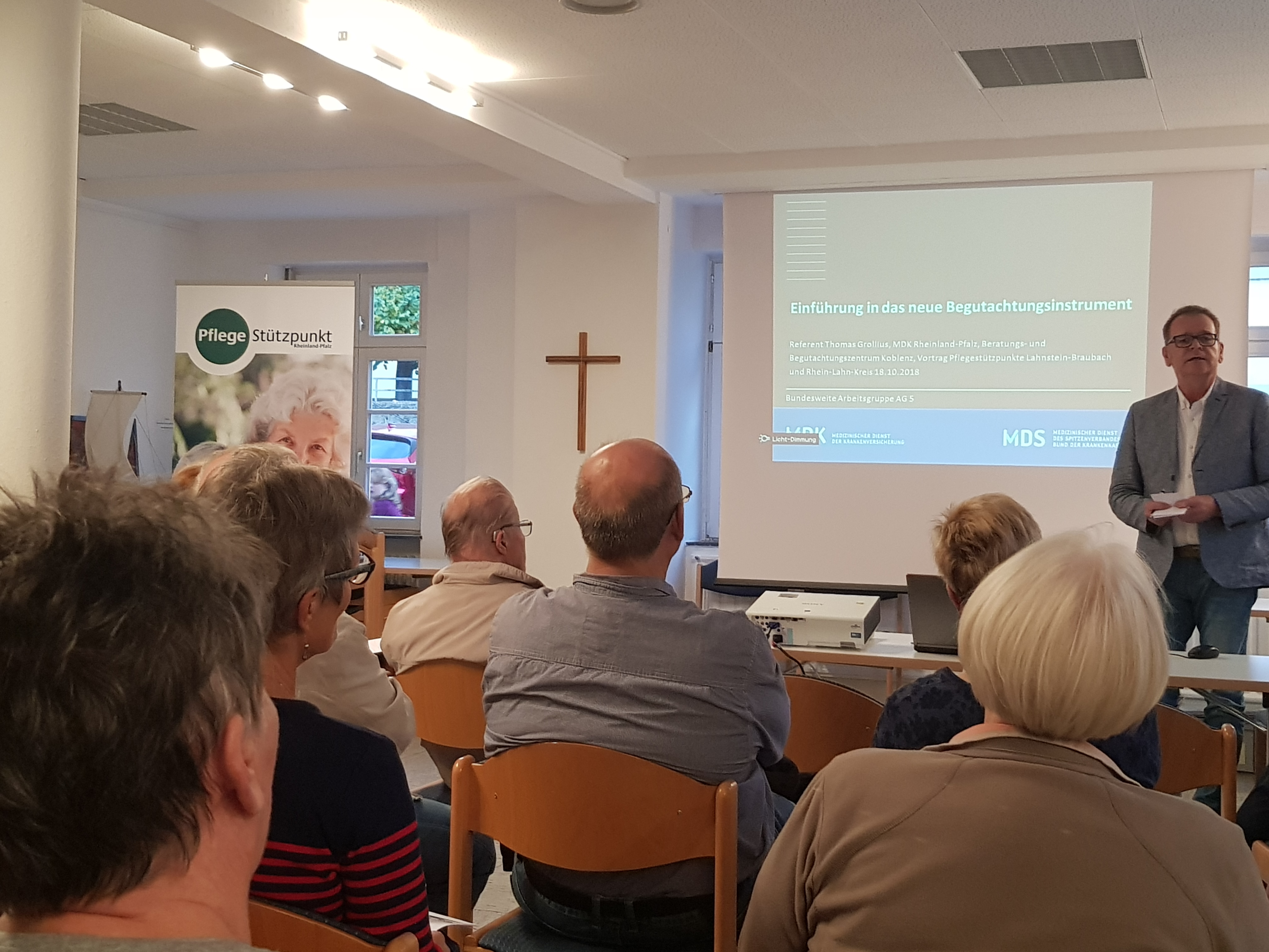 RHEIN-LAHN. (12. November 2018) Seit 2017 gilt das „zweite Pflegestärkungsgesetz“, mit dem die Pflegeversicherung erneut reformiert wurde. Hierzu gehörte auch, dass – wie schon lange gefordert – der Pflegebedürftigkeitsbegriff neu definiert und ein neues Begutachtungsinstrument eingeführt werden sollte. Zahlreiche interessierte Bürger waren der Einladung der Pflegestützpunkte im Rhein-Lahn-Kreis und der Regionalen Pflegekonferenz in den Gemeindesaal der Jakobusgemeinde Diez-Freiendiez gefolgt. Bettina Steckel-Linke vom Pflegestützpunkt Diez begrüßte Thomas Grollius vom Medinzinischen Dienst der Krankenversicherung (MDK), der ausführlich das aktuelle Begutachtungsverfahren erläuterte und Fragen der Gäste beantwortete.