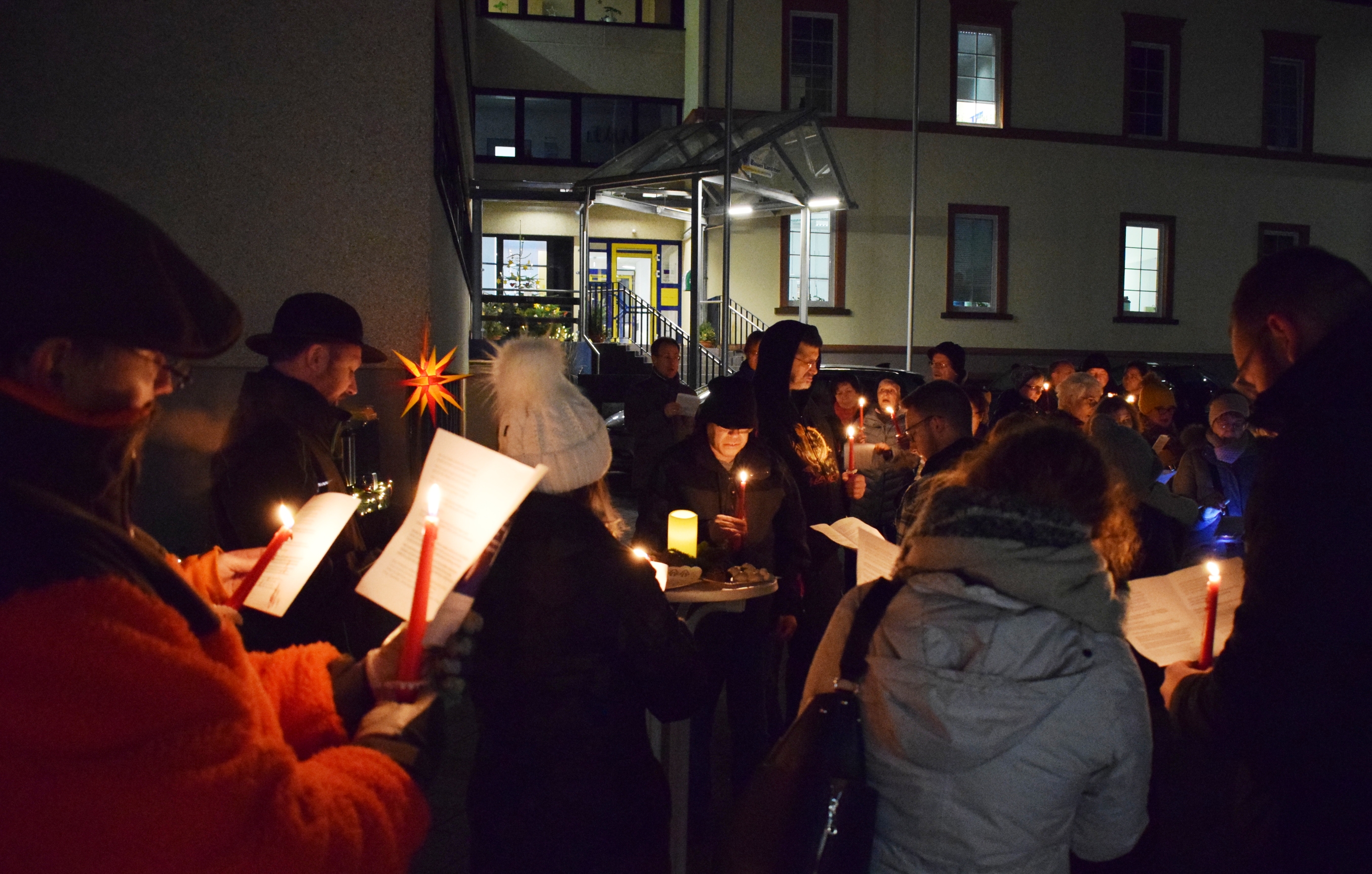 Stiftung Scheuern freuten sich über die Besucherschar. So war der Herrnhuter Stern mit seinen 25 charakteristischen Zacken auch zu Gast an der Verbandsgemeinde-Verwaltung Nastätten. Dort begrüßte Bürgermeister Jens Güllering die Gäste und freute sich, dass sich anlässlich der Aktion ein Chor in der Verwaltung gegründet habe. Der stimmte mal allein, mal mit allen Besuchern ein flottes Adventslieder-Medley an. „Sehen, hören, fühlen“, wie Güllering zur Begrüßung als Motto ausgab, wurden in die Tat umgesetzt sowohl bei den Liedern, mit leuchtenden Kerzen in den Händen als auch anschließend bei Gebäck und Getränken, die an einer langen beleuchteten Tafel kredenzt wurden.