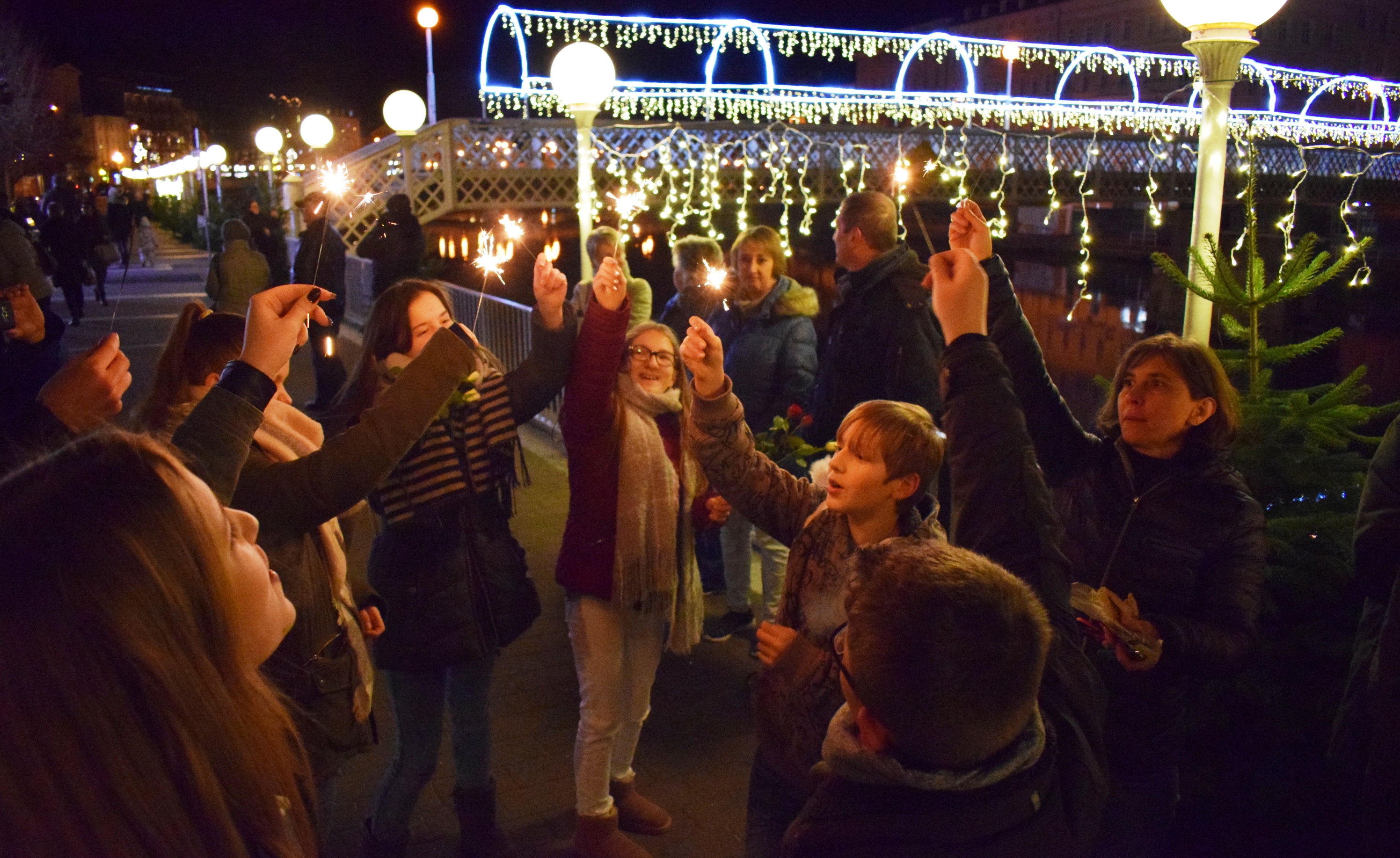 Der Baum war nicht die einzige Aufgabe der Jugendlichen, um etwas Freude und Licht ins Dunkel zu bringen, um auch im übertragenen Sinne zu zeigen, dass das Dunkel in der Welt und im Leben nicht das letzte Wort hat. Sie verteilten in der Kurstadt und am Markt zwischen Kurkolonaden und Römerquelle selbst gebackene Plätzchen, Süßigkeiten und Blumen an Passanten. Zum Abschluss ihres Besuchs entzündeten sie außerdem Wunderkerzen vor der schön illuminierten Brücke über die Lahn. Bernd-Chr. Matern