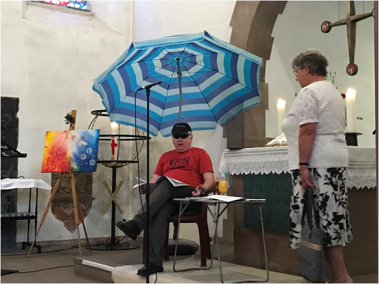 Das tat auch der Gottesdienst, der dazu aufrief, das Leben zu feiern, so wie auch Jesus gefeiert habe, wie Nele Klimaschka in der Schriftlesung berichtete, als er anlässlich der Hochzeit zu Kana Wasser zu Wein machte. Zum Feiern luden auch die Lieder ein, solche vom jüngsten Weltgebetstag aus Slowenien sowie die aus dem Gesangbuch. Niklas Klimaschka hatte den Gottesdienst mit Foto- und Filmsequenzen begleitet, Marita Fritsch bereicherte ihn unter anderem mit schönen Aquarellen und der Dekoration des Sommergottesdienstes.