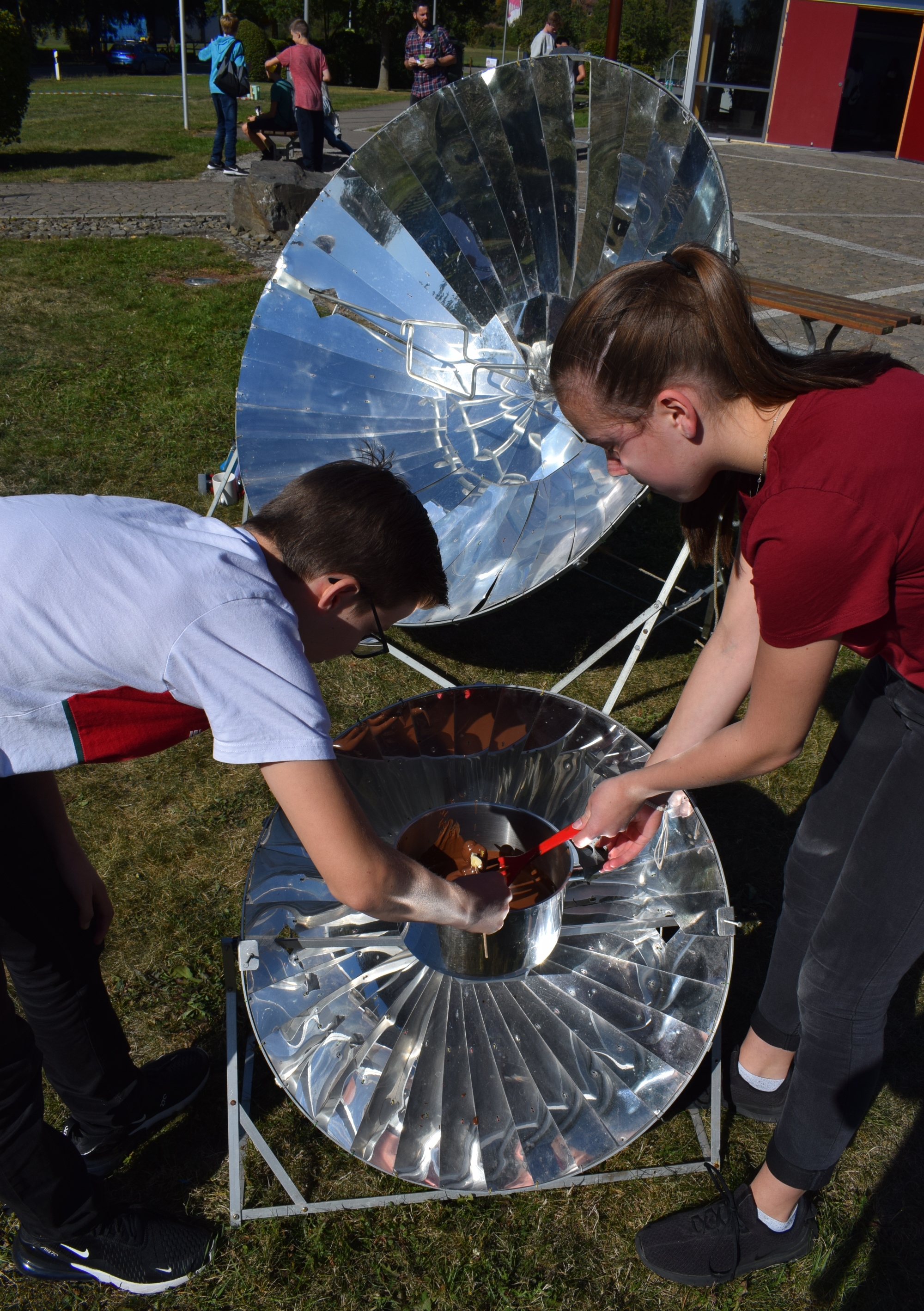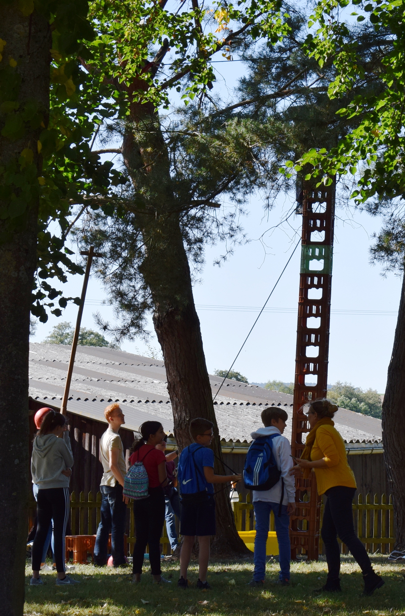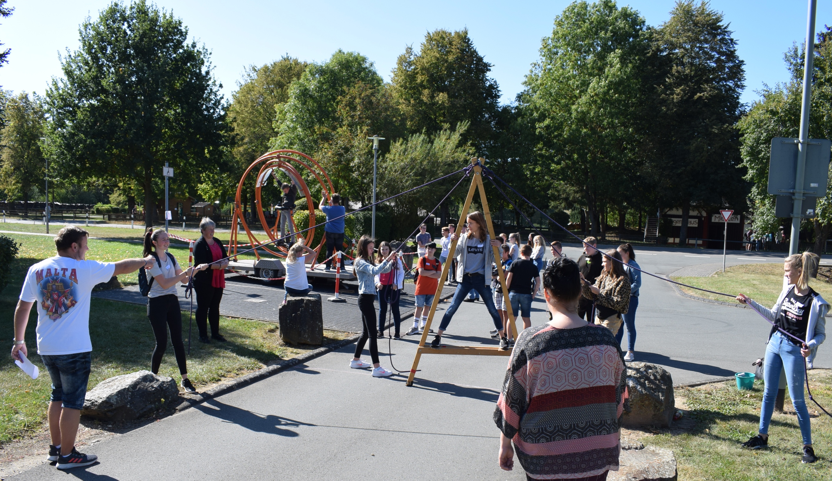 Dann warteten insgesamt mehr als 20 spannende Stationen auf die Jugendlichen; etwa die Hälfte davon konnte jede der 20 Gruppen absolvieren. Angeseilt Getränkekisten in den Himmel stapeln, am Astronauten-Trainer Schwerelosigkeit testen, auf der Rollenbahn Ringe mit der Lanze sammeln und am Lebendkicker um Tore kämpfen – viel sportlicher Ehrgeiz war angesagt. Aber auch knifflige Quizfragen mussten beantwortet, Vertrauensübungen absolviert und ein Safe geknackt werden.
