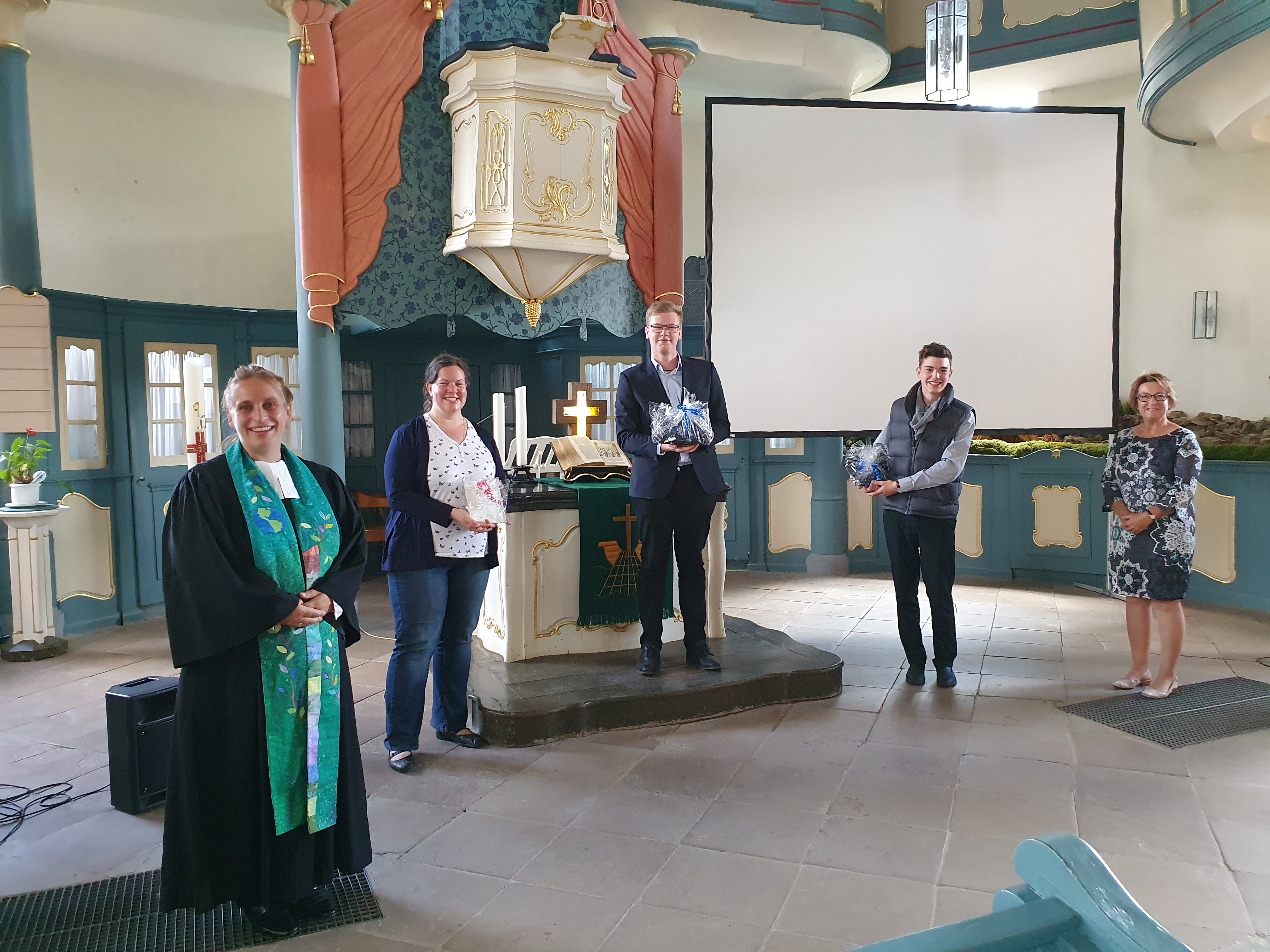 Nach einer einjährigen Ausbildung sowie einer Gottesdienstprüfung, die befähigt und berechtigt, selbständig Gottesdienste zu gestalten und ohne die Anwesenheit einer Pfarrperson mit der Gemeinde zu feiern, wurden Carolin Richter, Max Fischer und Jonas Völzke zusammen mit anderen Kursteilnehmenden im Januar in einem feierlichen Gottesdienst in Bad Camberg von Propst Oliver Albrecht für ihren Dienst in der Kirche gesegnet. Einen Beitrag dazu finden Sie hier. Aufgrund der Corona-Krise konnten sie erst jetzt auch in ihrer eigenen Gemeinde im neuen Amt begrüßt werden. Die Vorsitzende des Kirchenvorstandes, Gabi Schmidt, drückte ihren Stolz auf die so aktive nachwachsende Generation aus und überreichte T-Shirts mit dem Aufdruck „Ich gehöre zu Gottes Bodenpersonal“.