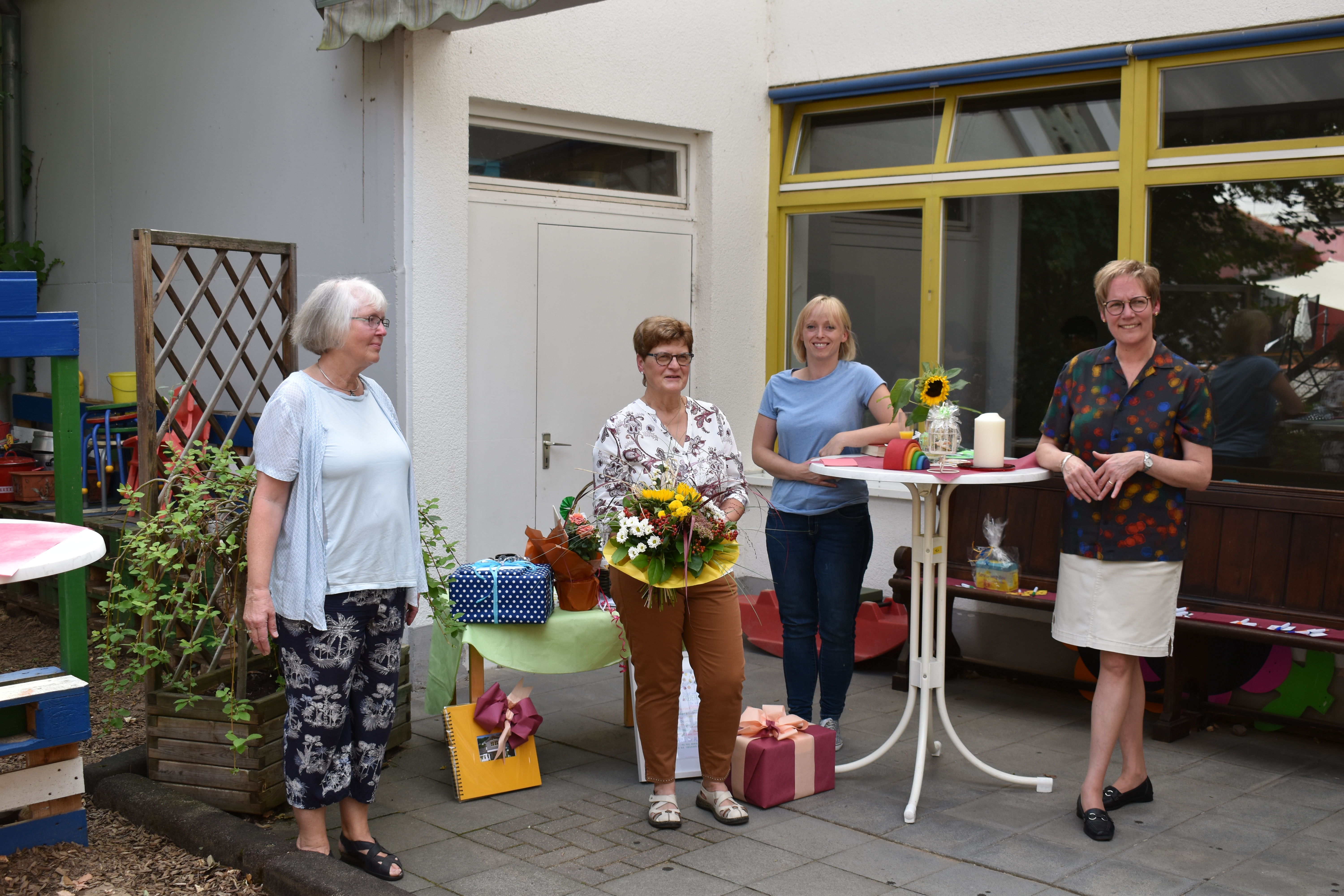 Wünschten Erika Didinger (2. von links) nach 24 Dienstjahren in der evangelischen Kita Arche Noah im Namen von Kindern, Team, Eltern und Kirchengemeinde für den Ruhestand Glück, Segen und Gesundheit (von rechts): Martina Griese, Stefanie Loos und Margit Mohr. Foto: Kita
