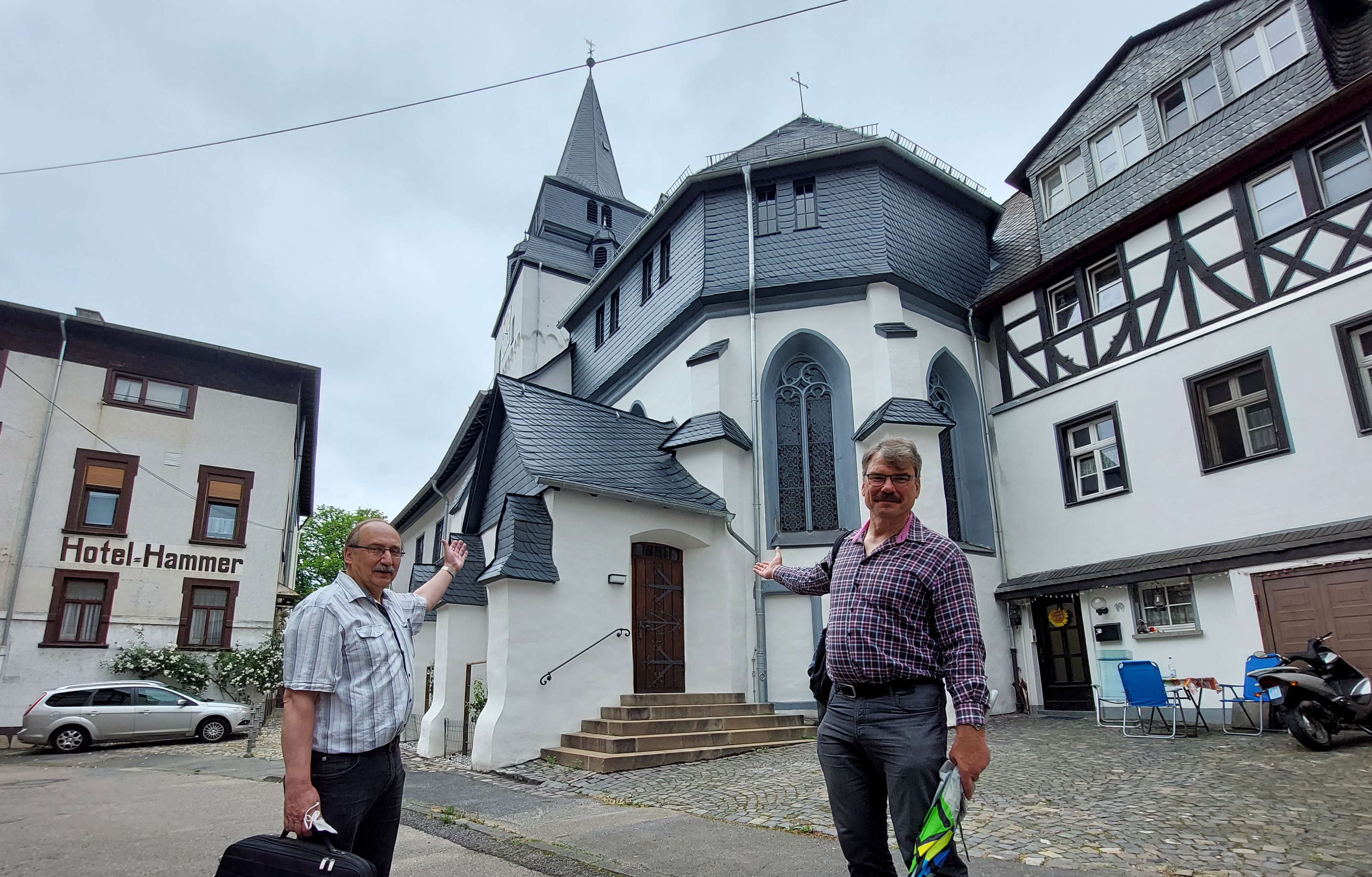 „Hereinspaziert!“ Gemeindepfarrer Martin Stock (rechts) und Kirchenvorstand Heinz Vickus freuen sich über die gelungene Sanierung der evangelischen Barbarakirche in Braubach und laden zum Festwochenende mit Führungen ein(Foto oben). Zimmermannsarbeit vom Feinsten zeigt sich nach der Sanierung. Auch die Decke des Kirchenschiffs zeigt sich in neuem Glanz. Die Turmlöcher, entstanden durch verfaulte rundes Tragehölzer, werden von Mauerseglern zum Nisten genutzt werden. Fotos: Matern