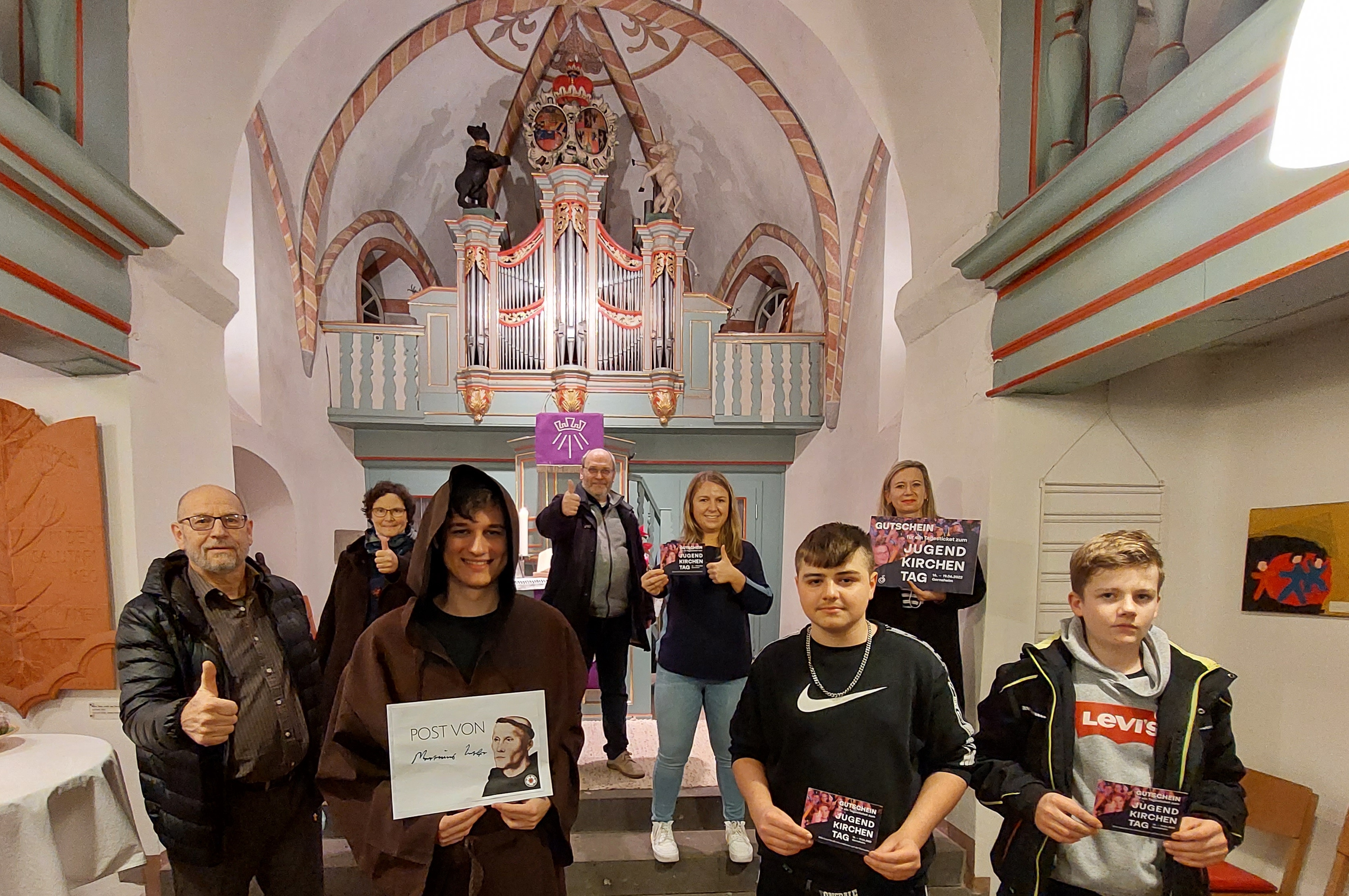 Eine Extra-Überraschung zu Weihnachten gab's für die Konfis der evangelischen Kirchengemeinde Eppenrod, die den ersten Platz bei einem landesweiten Stationenspiel in Worms gewonnen hatten. Martin Luther höchstpersönlich überreichte Urkunde und Preisgeld. Dazu gab es Freikarten für den Jugendkirchentag der Landeskirche. Verantwortliche der Evangelischen Jugend in der Propstei Rheinhessen und Nassauer Land gratulierten zu den kreativen digitalen Wettbewerbsbeiträgen. Foto: Matern