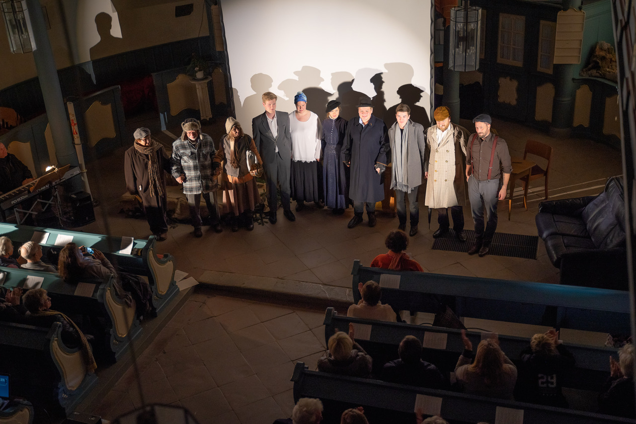 Unter der Regie von Helmut Vent brachten zehn Frauen und Männer der Kirchengemeinde ein Theaterstück zur Aufführung, das nachdenklich stimmte – über den Sinn und Unsinn des Schenkens und über die Liebe, die im Schenken ihren Ausdruck finden kann. Unterstützt von zahlreichen ehrenamtlichen Helfern in Technik, Requisite und Soufflage beeindruckten die Schauspielerinnen und Schauspieler durch ihre ebenso klare und berührende Darstellung sowie eine sorgfältige abgestimmte Kostümierung und Requisite. Musikalisch umrahmte Kirchenmusiker Uwe Weiland das Stück. Seine Klavierklänge sowie diverse Fotoprojektionen auf der Großleinwand versetzten das Publikum in das New York der 1920-er Jahre.