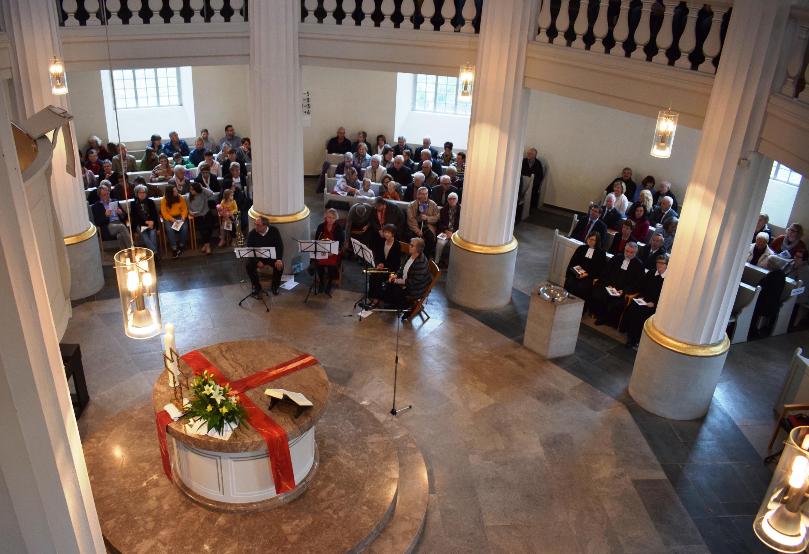 „Eine runde Sache ist das“, leitete Dr. Klaus-Volker Schütz, Propst für Rheinhessen und das Nassauer Land, seine Predigt ein und erinnerte an bedeutende Ereignisse aus dem Jahr 1819. Auch die damalige politische Situation sprach er an, in der Antisemitismus aufkeimten und liberales Denken bekämpft wurden; dabei seien gerade Freiheit und Verantwortung entscheidende Säulen der weltweiten Christenheit. „Dafür ist zu danken, dass Menschen christliche Verantwortung übernommen haben“, sagte Schütz und wandte mit dem Bibelwort „Mache dich auf und werde Licht!“ den Blick in die Zukunft, das heraushole aus Ich-Bezogenheit, Hass oder Zynismus. Gemeinde sei kein Verein wie es viele gibt, „sie ist eine Aufbruchsgemeinschaft“, die sich zwar in der Kirche treffe, aber die zum Licht für die Welt werden wolle. Gott habe die Menschen nicht in Kirchen, sondern in die Welt gesandt.