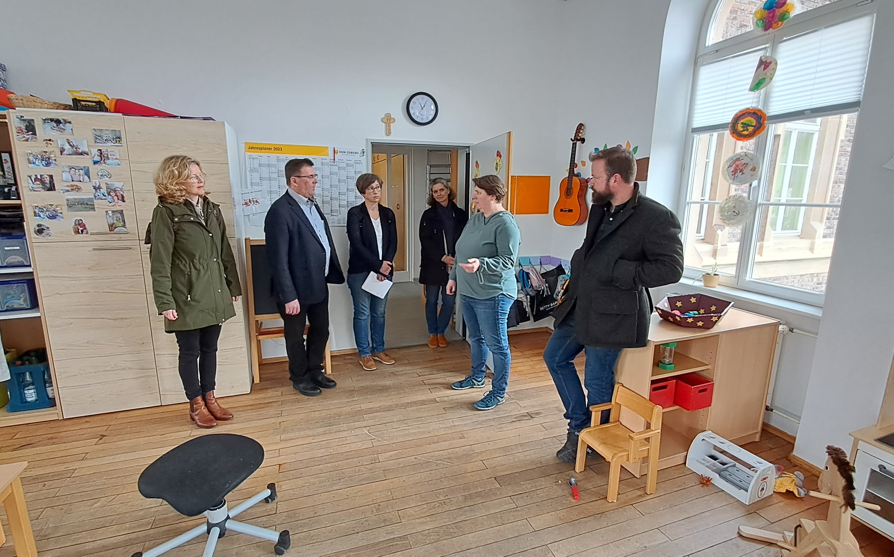 KAUB/RHEIN-LAHN. (5. Mai 2023) Eng, steil und verwinkelt – die Gebäudesituation der evangelischen Kindertagesstätte „Haus Sonnenschein“ in Kaub macht dem Personal zu schaffen. Umso dankbarer waren die Kita-Leiterin Petra Heinemann und ihr Team, dass sich Landrat Jörg Denninghoff jetzt ein Bild von den baulichen Bedingungen verschaffte, unter denen derzeit 27 Kinder aus Kaub, Dörscheid, Sauerthal und St. Goarshausen betreut werden.