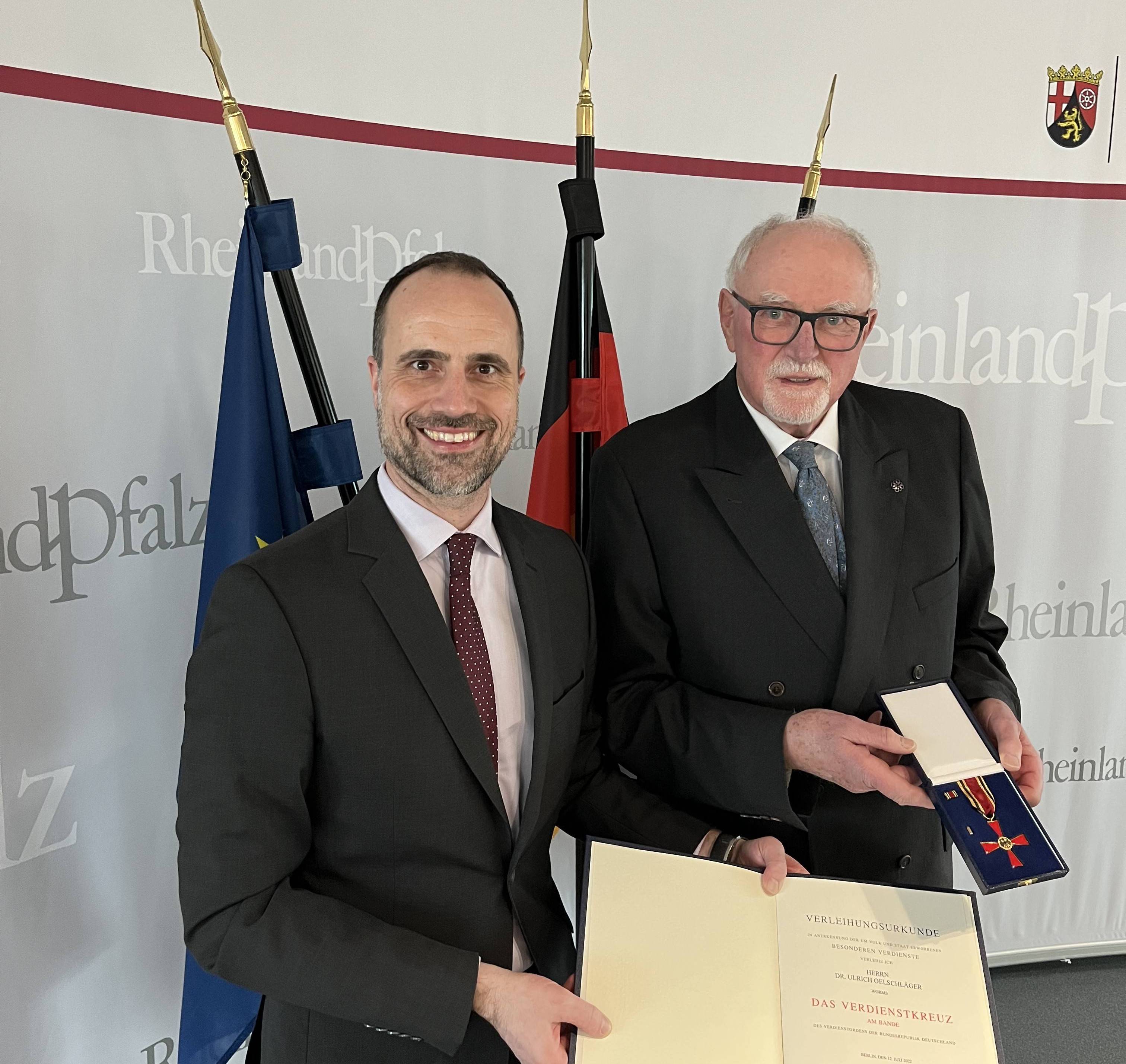 MAINZ/RHEIN-LAHN. (3. Februar 2023) Für sein langjähriges engagiertes Wirken im kirchlichen und kulturellen Bereich, insbesondere für sein Eintreten für eine friedvolle und tolerante Gesellschaft, hat Bundespräsident Frank-Walter Steinmeier auf Vorschlag von Ministerpräsidentin Malu Dreyer den in Worms lebenden Ulrich Oelschläger mit dem Bundesverdienstkreuz am Bande des Verdienstordens der Bundesrepublik Deutschland ausgezeichnet.