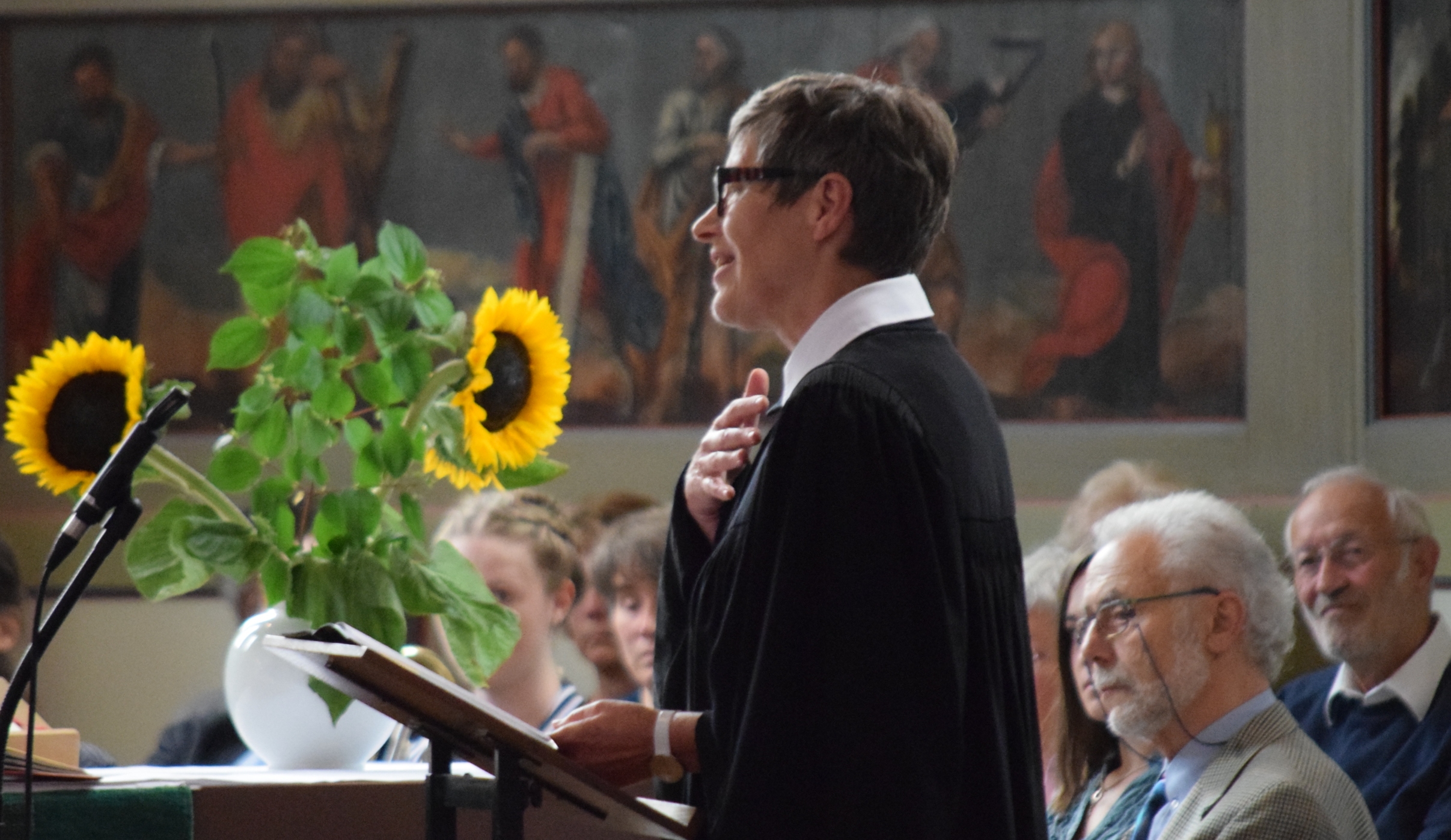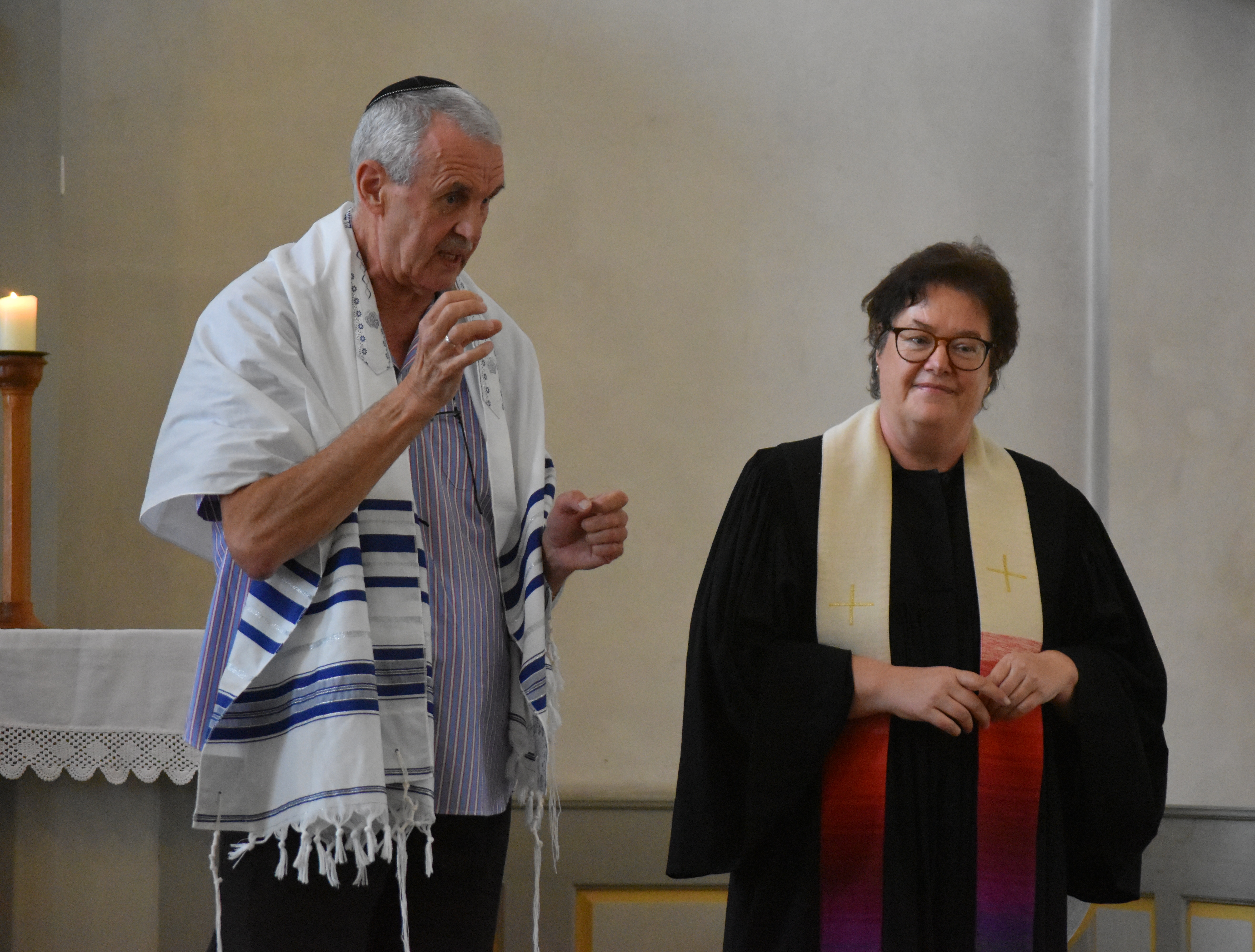 Ökumene-Pfarrerin Antje Müller freute sich, dass der jüdische Vorbeter Wolfgang Elias Dorr die Feier mitgestaltete. Die beiden gaben Einblicke in die jeweiligen Amtstrachten, deren Symbolik die gemeinsamen Wurzeln der beiden Religionen verdeutlichte. Müller erklärte etwa, was es mit dem schwarzen Talar und der regenbogenfarbenen Stola, die sie trägt, auf sich hat und Dorr stellte jüdische Kippa und Gebetskleidung vor; er erläuterte seinen Gebetsschal (Tallit) mit seinen Schaufäden (Zizits), von denen jede Franse für eines der 613 Ver- und Gebote der Tora steht. Auch wenn sie der gleichen Heiligen Schrift entstammen, nämlich dem Alten Testament der Bibel, könne man so viele Vorschriften wohl kaum einhalten, meinte Müller und erinnerte an die zehn Gebote, die Mose aufgetragen wurden. Gemeinsam wurden aus christlicher und jüdischer Sicht die beiden wichtigsten Gebote betont: die Liebe zu Gott und die Liebe zu den Menschen, die sich nicht nur auf „Glaubensfreunde“ beschränken solle, sondern auf alle Menschen, auch Fremde, wie die beiden mit der Geschichte „Lederherz“  deutlich machten, in der ein Pfarrer um 1850 berichtete, wie er Sterbebegleitung bei einem jüdischen Hausierer machte, indem er mit ihm das „Sch'ema Jisrael“ (Höre Israel) betete.
