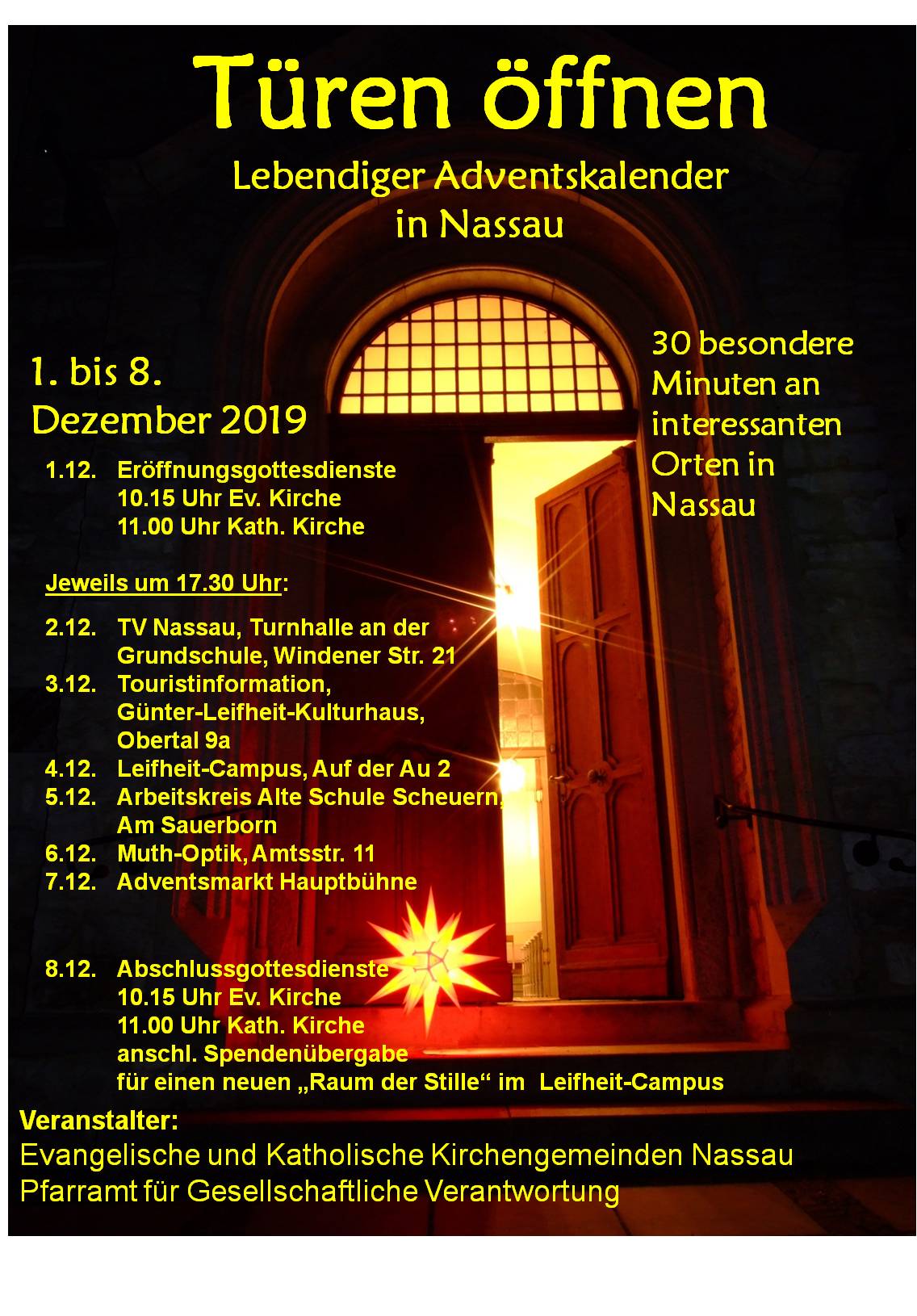 Auch in diesem Jahr wollen die evangelische und die katholische Kirchengemeinde in Nassau wieder gemeinsam mit einem lebendigen Adventskalender auf den Grund der Adventszeit hinweisen und vom ersten Advent, Sonntag, 1. Dezember, bis Sonntag, 8. Dezember Türen in der Stadt für besinnliche Momente und Begegnungen öffnen.
